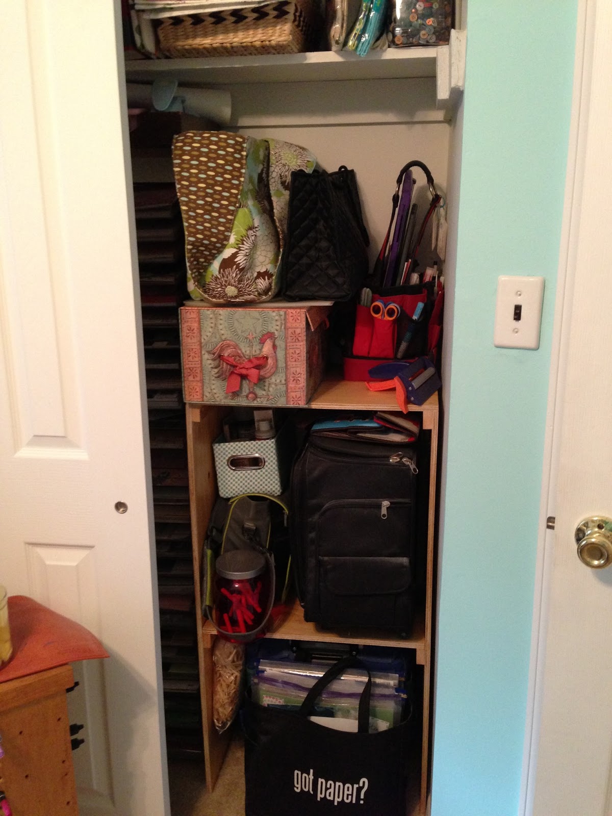 The dark brown table was a hand-me-down from my in-laws. The sides fold down if I need more floor space. The dark brown "colonial dry sink" was thrown out by neighbors, and I repurposed it for here. My copic markers are in plastic drawer units on the top shelf of the dry sink. My 8 1/2 by 11 cardstock are in the bottom. Baskets on the dry sink hold my acrylic blocks and glues.To the right of this dry sink unit is the closet: